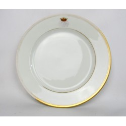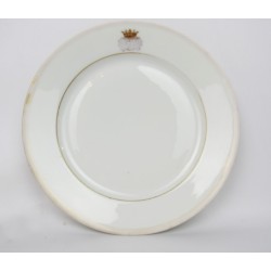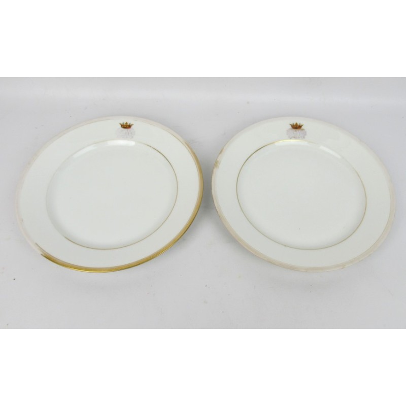 Par de pratos brasonados em porcelana francesa Vieux Paris do século XIX. Borda lisa dourada apresentando desgastes no ouro. Diâmetro 23 cm.